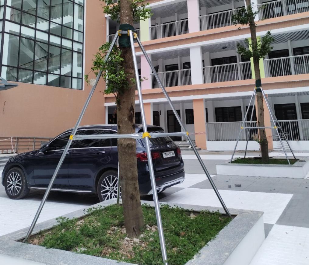 Trong điều kiện mưa kéo dài, đất dễ bị mềm và mất liên kết, làm cây có nguy cơ nghiêng hoặc đổ. Hệ cột chống giúp cố định cây trong suốt thời gian đất chưa kịp ổn định lại.